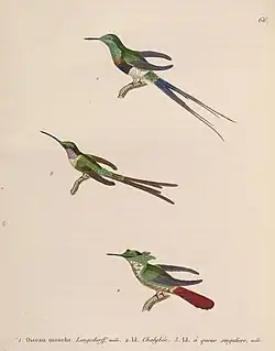 - ↑ Sowohl Trochilus longicaudus Gmelin, 1788 als auch Ocreatus ligonicaudus Gould, 1846 sind Synonyme für die Diskuselfe.