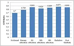 Der Bruttonationalglück-Index in Abhängigkeit von der Bildung: Im Vergleich zu 2010 konnte ein leichter Anstieg des Indexes für Menschen ohne formelle Schulbildung festgestellt werden. Wie das Diagramm 'Educational Level and GNH-Index 2015' zeigt, war jedoch weiterhin deutlich, dass die Zufriedenheit der Bewohner mit steigender Bildung zunahm.[39]