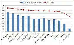 Der Bruttonationalglück-Index in Abhängigkeit vom Geschlecht: Männer wiesen mit einem Index von 0,783 und somit einem Anteil von 49 % glücklichen Menschen mehr Zufriedenheit auf als Frauen, bei denen der Index bei 0,703 lag und von denen nur 33 % als glücklich galten.[29]