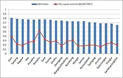 Der Bruttonationalglück-Index in Abhängigkeit vom Pro-Kopf-Einkommen in Distrikten: Die westlichen Distrikte wiesen einen höheren Index auf als die östlichen. Im Diagramm 'Per Capita Income and GNH-Index 2010' ist zu sehen, dass nicht in allen Fällen ein höheres Pro-Kopf-Einkommen eines Distriktes auch mit einem höheren Index einherging. Bewohner, die mit ihrem Einkommen nicht ihre Grundbedürfnisse decken konnten, zeigten sich jedoch als weniger glücklich.[27]