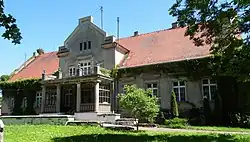 Das Gut Birkenfeld mit einer Größe von fast 1300 Hektar lag bis 1945 an der Straße nach Nordenburg (russisch Krylowo).[3] Heute befindet es sich unmittelbar an der polnischen Grenze zur russischen Oblast Kaliningrad, die mitten durch den Gutspark verläuft. Nach 1945 übernahm eine polnische Produktionsgenossenschaft die Birkenfelder Güter, das Herrenhaus nutzte man als Verwaltungsgebäude. Seit 1996 soll das frühere Gut in Privatbesitz sein.