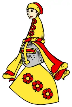 - In Gold pfahlweise drei rote Rosen. Als Helmzier ein wachsender Männerrumpf in Gold mit drei roten Rosen pfahlweise, roter Mütze und goldenem Stulp. Die Helmdecken sind aussen Rot, innen Gold.[7]