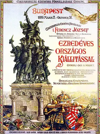 Ort der Millenniumsausstellung war das Budapester Stadtwäldchen (Városliget). Dort wurde aus diesem Anlass auch die Burg Vajdahunyad erbaut, die den zentralen historischen Teil der Ausstellung umfasste und etwa 20.000 wertvolle Kunstgegenstände, zumeist aus dem Besitz des ungarischen Adels, zeigte. Im Zentrum dieser Ausstellung stand der Thronsessel, auf dem der ungarische König und österreichische Kaiser Franz Joseph I., in diesem Jahr oft patriotisch als Árpád II. bezeichnet, den Ausgleich mit Ungarn unterzeichnet hatte. Mit diesem wurde der Habsburgerstaat zur Doppelmonarchie Österreich-Ungarn.