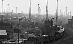 Mit der Verbindung der beiden städtischen Donauufer 1877 entstanden in den folgenden Jahren mehrere weitere Güterbahnen, Rangier- und Güterbahnhöfe.[25] Wichtigster Bahnhof für den Güterverkehr war neben den ebenfalls unweit der Donau im Süden der Stadt gelegenen Bahnhöfen Budapest-Dunapart und Budapest-Soroksári út rendező der etwa sechzig Hektar umfassende Rangierbahnhof Budapest-Ferencváros, der in die Bahnhofsteile Ferencváros Keleti rendező, Ferencváros Nyugati rendező und Ferencváros Gubacsi rendező eingeteilt wird und als der größte Bahnhof Ungarns gilt.[55] Auch auf der östlichen Seite des Personenbahnhofes existieren umfangreiche Verzweigungen. Der Verkehr stieg durch weitere Streckeneröffnungen, wie die der in den Süden des Landes führenden Bahnstrecke nach Subotica im Jahr 1882, welche wenige Jahre darauf bis Belgrad reichte, weiter an. Am südlichen Ende des Rangierbahnhofes begann zudem die sogenannte Burma-vasút, eine strategische Bahn, die im Südwesten von Budapest mehrere Bahnstrecken miteinander verband. Beim allgemeinen Verkehrsrückgang der 1990er Jahre sank auch im Rangierbahnhof der Bedarf, seit 1996 ist nur noch einer der beiden Ablaufberge in Betrieb.[55]