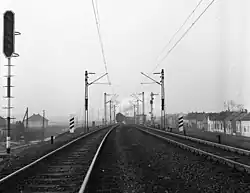 Da das Gaswerk von Budapest-Déli aus mit Kohle versorgt wurde, erfolgte 1947 die Elektrifizierung des Abschnittes Óbuda elágazás–Óbuda-Gázgyár sowie der Gleisanlagen der Brennerei, sodass die Züge mit den elektrischen Lokomotiven der Budapesti Helyiérdekű Vasút (BHÉV) bis in die Werke fahren konnten; Ende der 1950er Jahre wurden die Oberleitungsanlagen jedoch wieder zurückgebaut.[16] 1955 wurde südlich von Óbuda-Gázgyár die sogenannte „K-híd“ („K-Brücke“) über einen Nebenarm der Donau errichtet, um einen direkten Gleisanschluss zur Werft auf der Óbudai-sziget (deutsch Alt-Ofener Donauinsel) herzustellen. Dazu holte das Anschlussgleis nach rechts aus und kreuzte dann kurz vor der Brücke die Strecke.