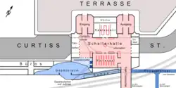 An der Nordseite des Empfangsgebäudes schließt auf Höhe der ersten Etage eine 150 Fuß (45,7 m) breite und 600 Fuß (182,9 m) lange[5] Terrasse mit Balustrade an. Sie umgibt die nördliche Hälfte des Bauwerks und diente als Zufahrt für Pkw, Taxis und Busse; die Ein- und Ausgänge des Bahnhofs liegen somit in der ersten Etage des Gebäudes. Der Raum unterhalb der Terrasse diente als Tiefgarage und sollte ursprünglich auch eine Wendeschleife für die Straßenbahn aufnehmen.