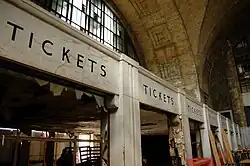 Die Schalterhalle liegt wie die Ein- und Ausgänge in der ersten Etage und nimmt mit 66 Fuß Breite und 225 Fuß Länge den gesamten Raum unter dem längs verlaufenden Tonnendach ein. Sie besitzt ein Guastavino-Tonnengewölbe, das aus gelbbraunen Terrakottaziegeln aufgebaut ist; die unteren 12 Fuß (3,66 m) Wandhöhe sind ringsum mit weißem Marmor verkleidet. Im Innern stehen einige Pavillons für Fahrkarten- und Gepäckschalter und verschiedene Verkaufsstände, die alle ebenfalls weiße Marmorvertäfelungen sowie Fensterrahmen mit Bronzeauflage besitzen. Der Fußboden besteht aus Terrazzo und weist vierfarbige geometrische Muster auf.[5]