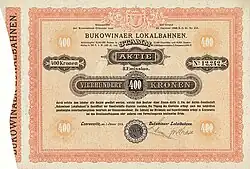 - Lokalbahn Hadikfalva–Radautz (heute Dornești–Rădăuți; Eröffnung am 17. November 1889 – Streckenlänge 8,140 km), diese Bahn wurde am 1. Juli 1898 an die Neue Bukowinaer Lokalbahn-Gesellschaft verkauft