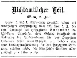 Eine 1913 vom Bukowiner Landtag verabschiedete Novellierung der Landtagswahlordnung versuchte, das System der Mehrheits- und Minderheitenmandate zu vereinfachen und die deutschen Mandate abzusichern, erhielt jedoch vor Kriegsausbruch nicht mehr die Sanktion aus Wien.[38]