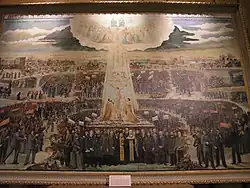 Zur feierlichen Weihung des Gonfanons und der Fahne des Bundes des russischen Volkes, die am 26. November 1906 (am Feiertag des Heiligen Georg) stattfand, kam auch Johannes von Kronstadt, der außerordentlich populär war.[4] Der „All-Russische Vater“ hielt eine Begrüßungsrede an die etwa 30.000 anwesenden Monarchisten. Er erinnerte an die große Bedeutung der Orthodoxie im Leben Russlands. In späteren Jahren trat er selbst in den Bund ein und wurde am 15. Oktober 1907 zum Ehrenmitglied auf Lebenszeit gewählt. Dann erschien Bischof Sergij (Stragorodski), der zukünftige Patriarch von Moskau und ganz Russland. Es wurde ein Gottesdienst zelebriert, an dessen Ende ein Loblied auf die kaiserliche Familie, die Gründer und Leiter des Bundes sowie das Totengedenken gesungen wurden.