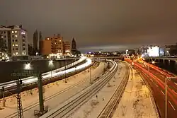 Bei der Errichtung des Autobahnkreuzes Schöneberg wurde westlich davon die Anhalter Bahn unterquert sowie dazu parallele Straßenverbindungen. Dazu wurde die 260 m lange Untertunnelung des Innsbrucker Platzes und der Ringbahn errichtet, und in den Tunnel ist die Ausfahrt Innsbrucker Platz integriert. Auf der östlichen Seite des Autobahnkreuzes war dann wiederum eine Untertunnelung einer Bahnstrecke vorgesehen. Weil die Trasse unter dem bereits stillgelegten Stellwerk Tpa der Dresdener Bahn durchführte, wurden Verhandlungen mit der Deutschen Reichsbahn begonnen, dem damaligen Inhaber der Betriebsrechte (mittelbar die DDR), die allerdings ergebnislos blieben.[12] Die Planung kam 1974 ins Stocken, da die DDR dem Abriss der alten Bahnbrücken nur zustimmen wollte, wenn der Senat einen neuen Güterbahnhof finanziert – zehn Jahre später brachen die Verhandlungen ganz ab.[13]
