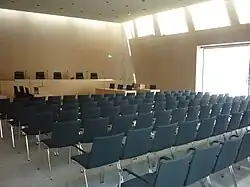 2011 wurde das sanierungsbedürftige und als zu abweisend erachtete Kontrollgebäude abgerissen und anschließend durch ein neues Empfangsgebäude ersetzt. In dessen Obergeschoss befindet sich zudem ein neuer großer Sitzungssaal für die Strafsenate, der am 6. März 2012 erstmals durch den 1. Strafsenat genutzt und am 18. April 2012 offiziell eingeweiht wurde.[43] Verhandlungsbesucher müssen nun nicht mehr vom Haupteingang zum alten Sitzungssaal geleitet werden, sondern passieren die Kontrolle im Erdgeschoss des Empfangsgebäudes und gelangen von dort direkt ins Obergeschoss zum neuen Sitzungssaal. Dieser umfasst 120 Zuschauerplätze.