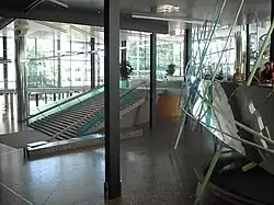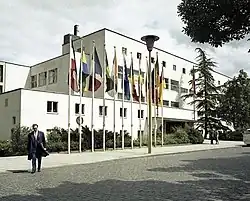 Der Südflügel des Bundeshauses wurde 1949 im Zuge der ersten Ausbauphase nach einem Entwurf von Hans Schwippert in Stahlskelettbauweise errichtet. Er beinhaltete zunächst eine große Sitzhalle (Ruhehalle) im Erdgeschoss mit Platz für rund 150 Personen[54][55], Lese- und Schreibraum für die Abgeordneten, Bibliothek und Archiv, Büros für Verwaltung, Sekretariat und Stenographen, Tresorraum, Druckerei und Buchbinderei.[56] Das 2250 m² umfassende, denkmalgeschützte Gebäude besteht aus einem Kellergeschoss, einem Erd- und zwei Obergeschossen mit circa 110 Büroräumen und einem Besprechungsraum. Es wurde bis 2013 saniert und ist seitdem Bestandteil des UN-Campus.