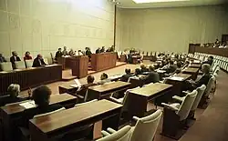„Von den geplanten Neubauten für Bundesrat und Bundestag blieb – auch auf Grund der klammen Haushaltslage des Bundes – nur der Neubau des Plenarsaals übrig“.[18] Mit Entwurf, Planung und Ausführung war 1983 das Stuttgarter Architekturbüro Behnisch & Partner beauftragt worden, das den mehrstufigen Wettbewerb im Jahr 1974 gewonnen hatte.[19] Die Bauarbeiten für den neuen Plenarsaal (Baukosten: ca. 120 Millionen Euro) begannen 1988, 1990 war das Gebäude weitgehend fertiggestellt. Die Sitzordnung des Bundesrates wurde für die Vertreter aller 16 Bundesländer erweitert. Mit der kreisrunden Sitzanordnung[20] wurde am 30. Oktober 1992 der neue Plenarsaal nach 20 Jahren Planungs- und vier Jahren Bauzeit feierlich eingeweiht.[21][22]