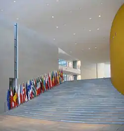 - 1. Etage: Internationaler Konferenzraum mit 32 Plätzen, Dolmetscherkabinen und Regieräumen. Inforaum mit Bühne, Sitzplätze für 200 Journalisten.