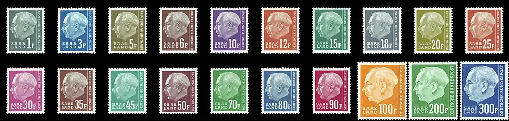 1957 wurde daher ebenfalls die Serie „Theodor Heuss“ in Franc-Währung, jedoch ohne einen Hinweis auf die verwendete Währung, bzw. ohne den Buchstaben „F“ mit der Inschrift „Saarland“ herausgegeben. Die Werte bis 25 Franc waren im Buchdruck, die Werte ab 30 Franc im Stichtiefdruck gedruckt; ab 100 Franc hatten sie auch ein größeres Format. Die Ausgaben ohne Währungsbezeichnung wurden am 30. Juni 1958 ungültig.