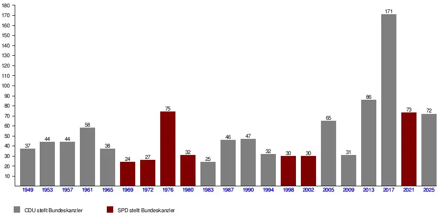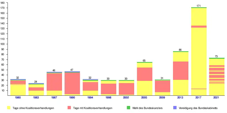 Im Durchschnitt wurde der Kanzler zwischen 1949 und 1976 nach 43 Tagen gewählt. Bei der Bundestagswahl 1976 war unabhängig von der Dauer von Koalitionsverhandlungen aufgrund der bis zu diesem Jahr gültigen Regelung im Grundgesetz über die Dauer der Wahlperiode eine Regierungsbildung erst über zwei Monate nach der Wahl möglich, seitdem ist sie immer spätestens 30 Tage nach der Wahl möglich. Seit 1980 wurde der Kanzler im Durchschnitt nach 54 Tagen gewählt.