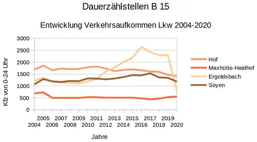 Das höchste Verkehrsaufkommen ist dabei an der Zählstelle bei Hof mit bis zu 22.500 Fahrzeugen (davon etwa 1750 Lastkraftwagen) pro Tag festzustellen. Die Zählstellen bei Maxhütte-Haidhof und Soyen verzeichnen ein ähnliches Verkehrsaufkommen von zirka 8000 bis 9000 Fahrzeugen pro Tag, wobei der Anteil an Lastkraftwagen in Soyen etwa 2,3 Mal so hoch ist wie in Maxhütte-Haidhof. Lag an der Zählstelle Ergoldsbach das Verkehrsaufkommen von 2004 bis 2011 bei 10.000 Fahrzeugen pro Tag, so ist dieses von 2011 bis 2016 (erstes Quartal) auf im Mittel 14.142 Fahrzeuge angestiegen, während sich dies bei Hof von 2004 auf 2016 leicht rückläufig entwickelte oder bei Soyen und Maxhütte-Haidhof nahezu konstant blieb. Von 2004 bis 2011 lag der Anteil an Lastkraftwagen bei Soyen und Ergoldsbach vergleichbar bei etwa 1250 Stück pro Tag. Von 2011 bis 2014 ist dieser bei Ergoldsbach aber deutlich angestiegen. In den drei Jahren von 2014 bis 2016 (erstes Quartal) blieben die Werte aber mit im Mittel 2115 Lastkraftwagen pro Tag nahezu konstant.