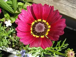 - 'Kokarde': die Strahlenblüten sind weiß mit einer roten und gelben Zone, die Scheibenblüten sind dunkel.