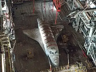 15. November 1988 | Unbemannter Testflug, automatische Landung nach zwei Orbits. | Einziger Flug eines Shuttles des Buran-Programms ins Weltall (Flugzeit: 2 Stunden, 20 Minuten), zerstört beim Einsturz des Nordteils des Daches der für das N1-Programm errichteten und für das Programm Energija-Buran genutzten Montagehalle MIK-112 (45° 55′ 41″ N, 63° 17′ 53″ O) in Baikonur am 12. Mai 2002.[14][15][16] Die Raumfähre hieß ursprünglich Baikal.[17] |