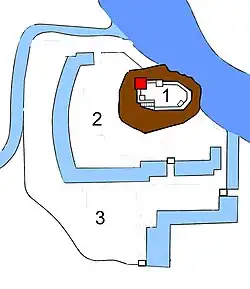 Die Burg nutzt die Anhöhe am Westufer des Flusses Hijikawa, in die sie etwas hinein ragt und dadurch an der Ostseite durch den breiten Fluss gut geschützt ist. Vom Hijikawa aus wurde das Wasser für den inneren Graben (内堀, uchibori) abgezweigt, der das Hommaru und das Ni-no-maru umschloss. Außerdem wurde vom Fluss Wasser für den äußern Graben (外堀, sotobori) abgezweigt, der die Ostseite des San-no-maru schützt. Auf der Westseite war das San-no-maru durch den im Verlauf angepassten Fluss Kumegawa (久米川) geschützt.