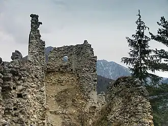 ![]() Ein Teil der Burgruine, mit der Großen Fatra im Hintergrund | ||