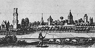 Für das 13. Jahrhundert sind mehrere Burggrafen für Dinslaken belegt, so zum Beispiel 1226 ein Rutgerus sowie um die Mitte des 13. Jahrhunderts Heinrich, der gemeinsam mit seinen beiden Brüdern Philipp und Gottfried mehrfach in Urkunden genannt wurde.[8] Deren Familie verlor das Burggrafenamt nach 1263 und wurde anscheinend durch den Grafen Dietrich V. von Kleve verdrängt, der Dinslaken seinem Herrschaftsbereich einverleibte.[9] Frühere Darstellungen, Dinslaken sei durch die Heirat Dietrichs IV. von Kleve mit einer Dinslakener Erbtochter namens Mathilde in den Besitz des Grafenhauses gelangt, lassen sich historisch nicht belegen.[1] Südlich der Burg entstand wahrscheinlich schon früh eine Siedlung, die 1273 unter Dietrich V. Stadtrechte erhielt.