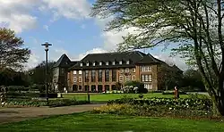 Die Burg Dinslaken, früher auch Kastell Dinslaken genannt, ist eine Burganlage in der nordrhein-westfälischen Stadt Dinslaken und zugleich ihre Keimzelle. Auf einer Erhebung im ehemaligen Sumpfgebiet zwischen Rhein, Rotbach, Emscher und Lippe wahrscheinlich als Motte errichtet, war sie im Mittelalter eine der wichtigsten klevischen Landesburgen.[1] In der frühen Neuzeit sank ihre Bedeutung, und die Anlage wurde fast nur noch als Sitz von Rentmeistern und Richtern genutzt. Mehrfach durch Brände beschädigt, erfolgten im 17. und 18. Jahrhundert immer wieder Aus- und Umbauten an der Burg, ehe sie zu Beginn des 20. Jahrhunderts von der Stadt Dinslaken erworben und zum Kreishaus umgebaut wurde. Nach schweren Schäden im Zweiten Weltkrieg wurde das Kastell in modernen Formen wiederaufgebaut und dient heute unter anderem als Rathaus der Stadt. Es steht seit dem 4. April 1984 als Baudenkmal unter Denkmalschutz.