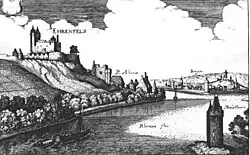 ![]() Burgruine Ehrenfels vom Rhein aus gesehen, Südost-Ansicht | ||