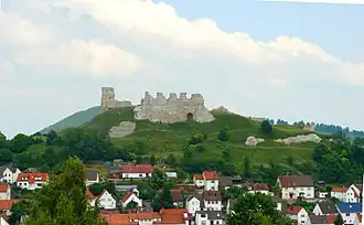 Die Höhenburg liegt beherrschend und weithin sichtbar in 579 Meter Höhe auf einem Kalksteinkegel am Riesrand bei Bopfingen.