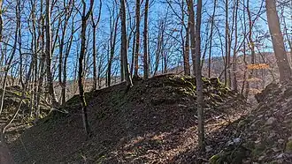 Die Burg, verlaufend auf mehreren künstlich angelegten Plateaus, getrennt von vier Halsgräben, verfügte über eine Kernburg aus mehreren einzelnen Gebäuden, eine Vorburg mit Schildmauer, die Teil eines Wohnturms war, und zum abfallenden Bergrücken hin einen fünften Halsgraben mit Wall. Kernburg und Vorburg waren durch einen sieben Meter tiefen Abschnittsgraben getrennt.