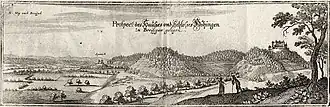 ![]() Ausschnitt mit der Burg aus dem Kupferstich von Matthäus Merian von 1644 | ||