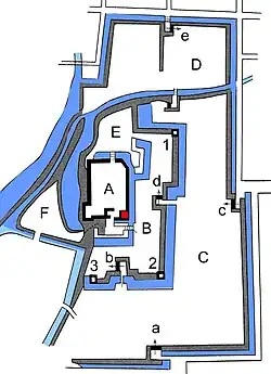Die Burg ist in drei der Höhe nach gestaffelten Hauptbereiche gegliedert: Von unten nach oben sind das der dritte Burgbereich (三の丸, San-no-maru; C), der zweite Burgbereich (二の丸, Ni-no-maru; B) und der innere Burgbereich (本丸, Hommaru; A). Dem untersten Bereich sind vorgelagert der vierte Burgbereich (四の丸, Yon-no-maru; D) im Norden und der West-Burgbereich (西の丸, Nishi-no-maru; E). Der zweite Burgbereich wird im Norden ergänzt durch den inneren Nordbereich (内北門 Uchikita-no-maru; F).