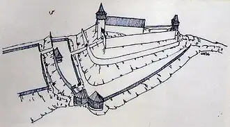| Erhaltungszustand | Reste von Mauern, Wällen und Gräben der Vorbefestigung | |
