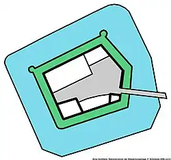 Das Steinhaus im Südwesten der Anlage und die teilweise erhaltenen Umfassungsmauern mit Überresten von zwei Ecktürmen sind die ältesten Teile der ursprünglich fünfeckigen Anlage, die von einem 10 Meter breiten Wassergraben umgeben war. Der Wassergraben, der von einer Zugbrücke überspannt wurde, ist teilweise verfüllt. Der noch erhaltene größere Teil des Grabens ist ausgetrocknet und wird als Garten genutzt.