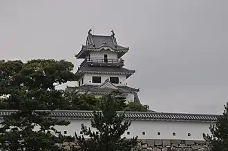 Erhalten geblieben ist das Hommaru samt breitem Wassergraben. Wieder aufgebaut wurden der Hauptturm mit Nebengebäuden, drei Toranlagen und drei Wachtürme an den Ecken im Norden, Westen und Osten. Auch ein Teil der Wallbekrönung mit langgestreckten, niedrigen Bauwerken zur Verteidigung, tamon (多聞) yagura genannt, ist zu sehen. Auf dem Gelände befinden sich der große Fukiake-Schrein (吹揚神社, Fukiage-jinja) in der Mitte, der kleinere Sumiyoshi-Schrein (住吉神社, Sumiyoshi-jinja) im östlichen Eck, der Inari-Schrein (吹揚稲荷神社, Fukiage Inari-jinja) im südlichen Eck, der Doi-Schrein (土居神社, Doi-jinja) an der Nordseite und der Weihrauch-Schrein (麁香神社, Adaka jinja) im westlichen Eck.