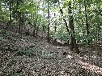 Der Übergang zum Bergrücken im Norden mit dem deutlich überhöhten Burgbereich. | ||