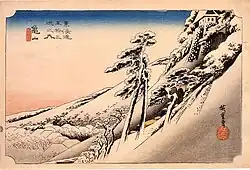 Südlich der Burg führte die Verbindungsstraße von Edo, dem heutigen Tokyo, und Kyoto vorbei, der Tōkaidō. So erscheint Kameyama auf Holzschnitt-Serien der Edo-Zeit mit den Poststationen dieser Straße. Besonders bekannt ist das Blatt von Hiroshige, das die Burg zeigt.