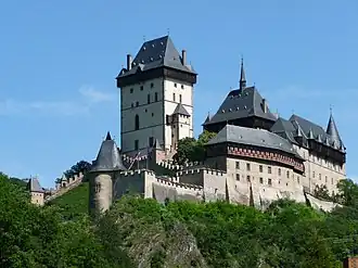 Die Burg Karlstein (tschechisch Hrad Karlštejn) ist eine gotische Burg im böhmischen Karlštejn (deutsch Karlstein), etwa 30 km südwestlich von Prag. Mit rund 147.000 Besuchern im Jahr 2024 ist sie eine der meistbesuchten Burgen Tschechiens.[1] Die ursprüngliche Höhenburg wurde 1348 von Kaiser Karl IV. gegründet und beherbergte zunächst bis 1421 die Reichskleinodien des Heiligen Römischen Reiches. Auch die Wenzelskrone des Königreichs Böhmen wurde zeitweise in der Burg Karlstein aufbewahrt.