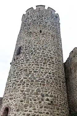 Nur 30 Zentimeter hinter der Schildmauer steht der Bergfried der Burg und deckte damit ebenfalls die Angriffsseite. Der Turm ist eines der ersten Exemplare solch runder Bergfriede am Oberrhein und hat Ähnlichkeit mit dem Hauptturm der Pflixburg.[11] Er war als reiner Wehrturm angelegt und nicht bewohnbar, was zum Beispiel durch das Fehlen von Aborten deutlich wird.[33] Sein Mauerwerk war früher wahrscheinlich verputzt.[25] Die Turmhöhe beträgt 24,8 Meter bei einem Außendurchmesser von 11,2 Metern.[34] Durch seine über vier Meter dicken Mauern besitzt sein Inneres nur einen Durchmesser von 2,4 Metern.[34] Dieses war in vier Geschosse unterteilt. Das seinerzeit lichtlose Erdgeschoss diente als Verlies. Die darüber liegende Etage hatte eine Höhe von neun Metern[30] und erhielt nur über einen einzigen Lichtschlitz spärliche Erleuchtung. Die Konsolen für ihren Holzfußboden sind zum Teil noch erhalten. Das zweite Geschoss diente als Lager.[11] Von dort war die Wehrplatte auf dem Dach erreichbar. Heute führt eine moderne Wendeltreppe aus Beton vom Erdgeschoss dorthin. Der dortige Zinnenkranz erhielt im Spätmittelalter Anpassungen für Feuerwaffen wie Arkebusen und Feldschlangen.[35] Allerdings ist er nur noch bis zu einer Höhe von 0,55 Metern original, der Rest ist eine Rekonstruktion.[11] Der heutige Eingang im Erdgeschoss des Bergfrieds ersetzte im 19. Jahrhundert den ursprünglichen Hocheingang an der Südseite des Turms auf 10,6 Meter[30] Höhe. Diese Rundbogenpforte besitzt ein Gewände aus flachen Buckelquadern, ist 1,80 Meter hoch und 0,73 Meter breit.[36] Sie war früher über einen vorgelagerten, hölzernen Balkon erreichbar, von dem noch drei Kragsteine erhalten sind.