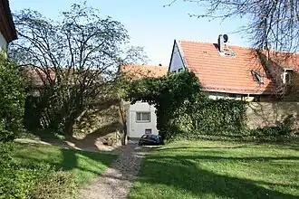 ![]() Die Kirchhofmauer enthält noch Teile der ehemaligen Burganlage. | ||