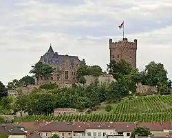 Ihre heutige Gestalt erhielt die Burg im Zuge der Rheinromantik im 19. Jahrhundert. Nach einem Teilwiederaufbau (Brücke, Torhaus, Wehrgang und Bergfried) durch Ludwig Maria Cron im Jahr 1853 ließ der Architekt und vormalige Binger Bürgermeister Eberhard Soherr von 1875 bis 1879 das neugotische Hauptgebäude als bürgerliche Sommerresidenz errichten. Seit 1897 ist in der Burg ein Teil der Binger Stadtverwaltung untergebracht, darunter das Büro des Oberbürgermeisters.[2] Vom heutigen Aussehen kann man nicht auf die ursprüngliche Gestalt schließen. Aus dem Mittelalter erhalten blieben lediglich die unteren Mauern des Bergfriedes, der Halsgraben und Teile der südlichen Ringmauer mit Resten des Wehrgangs. Der 37,5 m hohe Bergfried ist in den Sommermonaten tagsüber geöffnet und kann als Aussichtsturm bestiegen werden.[3]