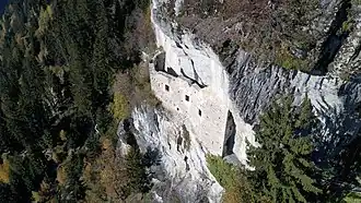 Der Zugang zum dreigeschossigen langgezogenen Gemäuer ist nur über einen steilen schmalen Pfad von Osten her möglich, der in den 1950er Jahren anlässlich einer Restaurierung verbreitert und durch Geländer gesichert wurde. Initiiert und finanziert wurde das Projekt durch den nach Kanada ausgewanderten Waltensburger Bürger Paul Gabriel.