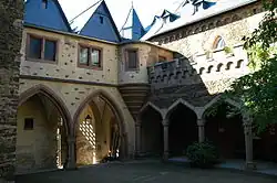 1475 zu Beginn seiner zweiten Amtszeit wurde von Erzbischof Diether II. von Isenburg ein zweiter Mauerring mit Zwinger, drei Schalentürmen, dem Fuchsturm und einen viereckigen Torturm[2] zur Angriffsseite vorgelagert.