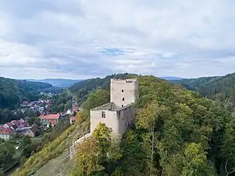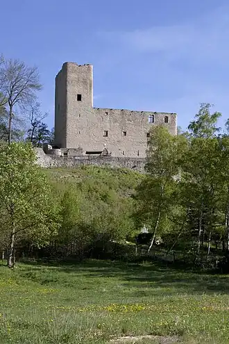 Der Turm liegt an der Westseite und gliedert sich in fünf Geschosse. Der Eingang zu den Turmgeschossen befand sich auf der Höhe des zweiten Obergeschosses des Wohnbaus, ein anderer im Erdgeschoss wurde erst im 16. Jahrhundert hinzugefügt. Der Turm wurde über seinen repräsentativsten Raum vom Wohnbau aus betreten. Dieser Raum ist mit einer Spitztonne gewölbt und mit Rechteckfenster im Süden ausgestattet. Es gab auch hier einen auch Aborterker. Der obere Mauerabschluss des Turms ist verloren, doch alte Ansichten lassen Zinnen vermuten.[2] Ursprünglich war der Kernbau von einer Zwingermauer umgeben, die heute noch in Teilen sichtbar ist. Sie ist ähnlich wie bei den schwarzburgischen Burgen Ehrenburg in Plaue und Ehrenstein in die erste Hälfte des 14. Jahrhunderts zu datieren.[3] Außerdem umgibt an drei Seiten ein 12 Meter tiefer Halsgraben die Burganlage.