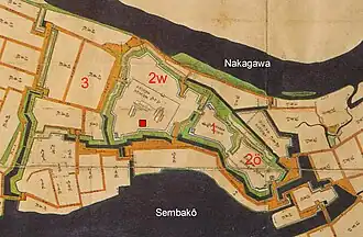 1 Hommaru, 2ö östliches Ni-no-maru, 2w westliches Ni-no Maru, 3 San-no-maru. Rotes Quadrat: Yagura.