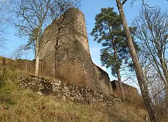 Die relativ kleine Burganlage bildete ein unregelmäßiges Viereck ohne Bergfried. Die Anlage wurde durch eine mächtige, heute noch 15 Meter hohe und an ihrer Basis 4,7 Meter starke Schildmauer im Westen geschützt. Ein künstlicher Halsgraben trennte die Burgstelle vom Berg. Von der ehemaligen Burganlage ist neben wesentlichen Fundamenten der Kernburg und den Resten einer vorgelagerten vermutlichen Zwingeranlage noch die mächtige Schildmauer erhalten.