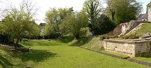 ![]() Der Schlossberg als Standort der Burg Peine mit dem früheren Burggraben, Rest einer Kasematte, Eskarpemauer und Steinbrücke | ||