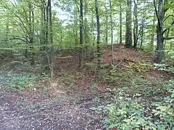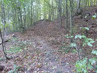 Übersicht innerer Wall (links ehemaliger Zugangsbereich, Nord), oben südlicher Teil des Walls -