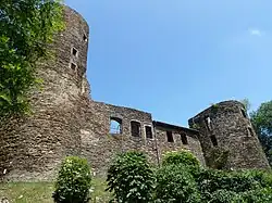 Die heutige Ruine ist nur ein kleiner Teil der ehemaligen Burganlage. Ihre aus schieferhaltigem Sandstein errichtete, durch fünf Türme verstärkte Umfassungsmauer umschließt ein 60 mal 55 Meter[5] großes Areal; den einstigen Innenhof. Der dort befindliche Burgbrunnen ist ebenso verschwunden wie der nördlich vorgelagerte Wehrgraben, der heutzutage zugeschüttet ist. Genauso verhält es sich mit den gewaltigen Mauern, die früher den äußeren Burghof umschlossen und bis ins Ulftal reichten. Sie sind ebenfalls nicht mehr existent. Erhalten ist indes ein großer Teil des dreigeschossigen Bergfrieds in der Südwest-Ecke, weil er 1901 zum Teil wiederaufgebaut wurde. Seine 1,25 Meter[6] dicken Mauern stürzten wahrscheinlich schon 1616 das erste Mal ein. Im Inneren des runden Turms sind noch Reste von Kaminen zu sehen.